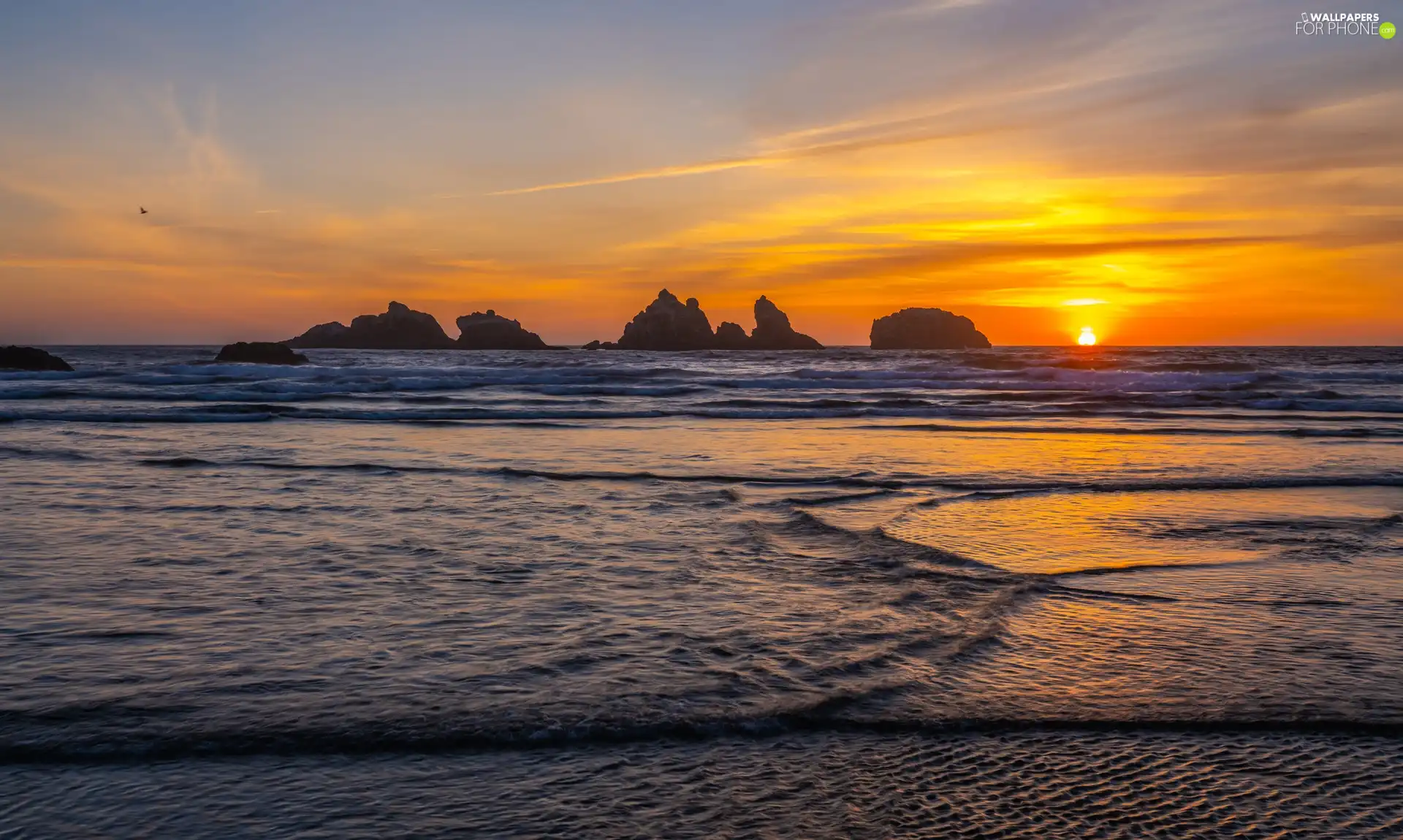 Waves, sea, Sky, Bird, Great Sunsets, rocks