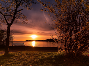 reflection, Great Sunsets, Fog, clouds, lake, Boat, birds