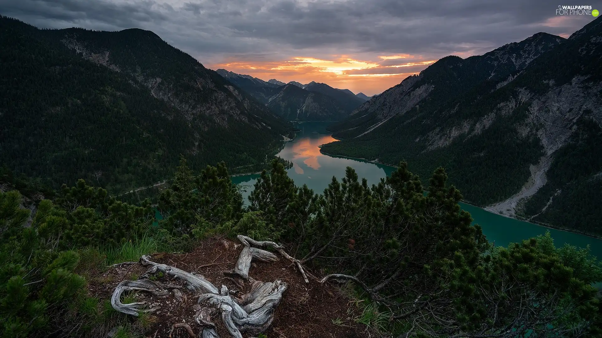 trees, lake, Great Sunsets, forest, Mountains, viewes, clouds