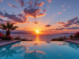 Flowers, Garden, sea, Palms, Pool, Great Sunsets, deck chair