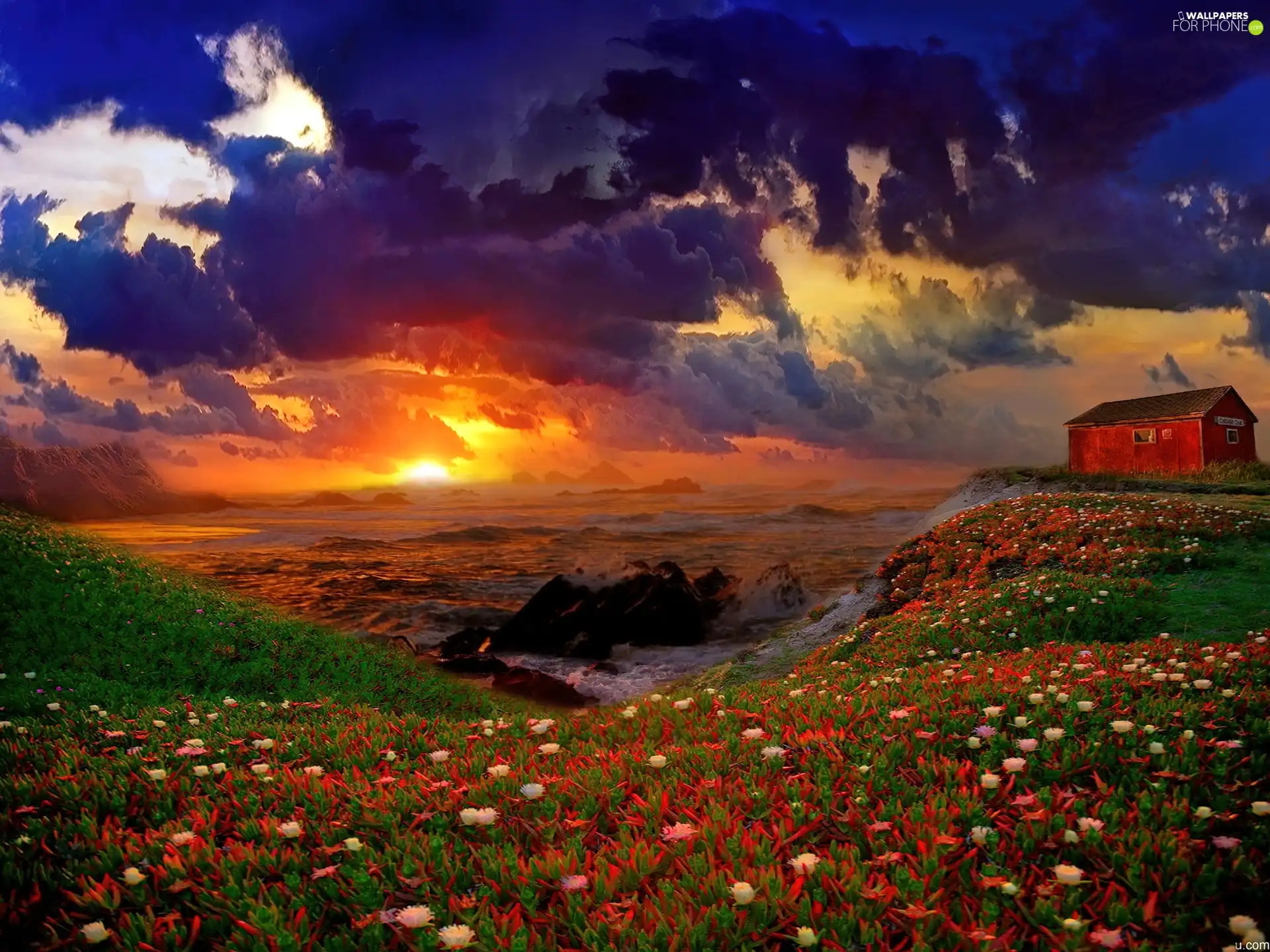 west, sea, Flowers, sun