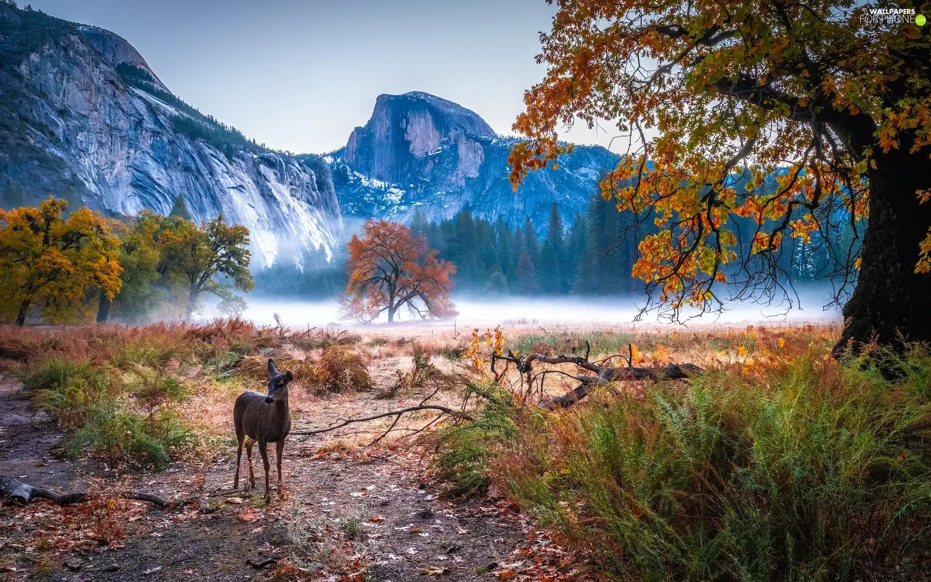 trees, California, Mountains, roe, autumn, The United States, Yosemite National Park, Lod on the beach, viewes, Fog