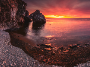 HEADPHONES, girl, Sunrise, graphics, sea, Bench