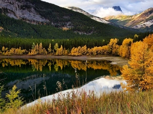 autumn, Mountains, viewes, grass, trees, lake