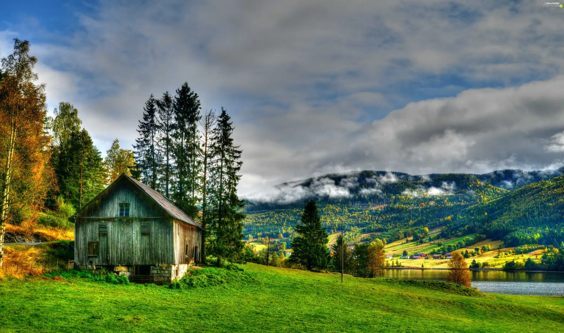 Fog, lake, HDR, grass, viewes, Mountains, Home, trees