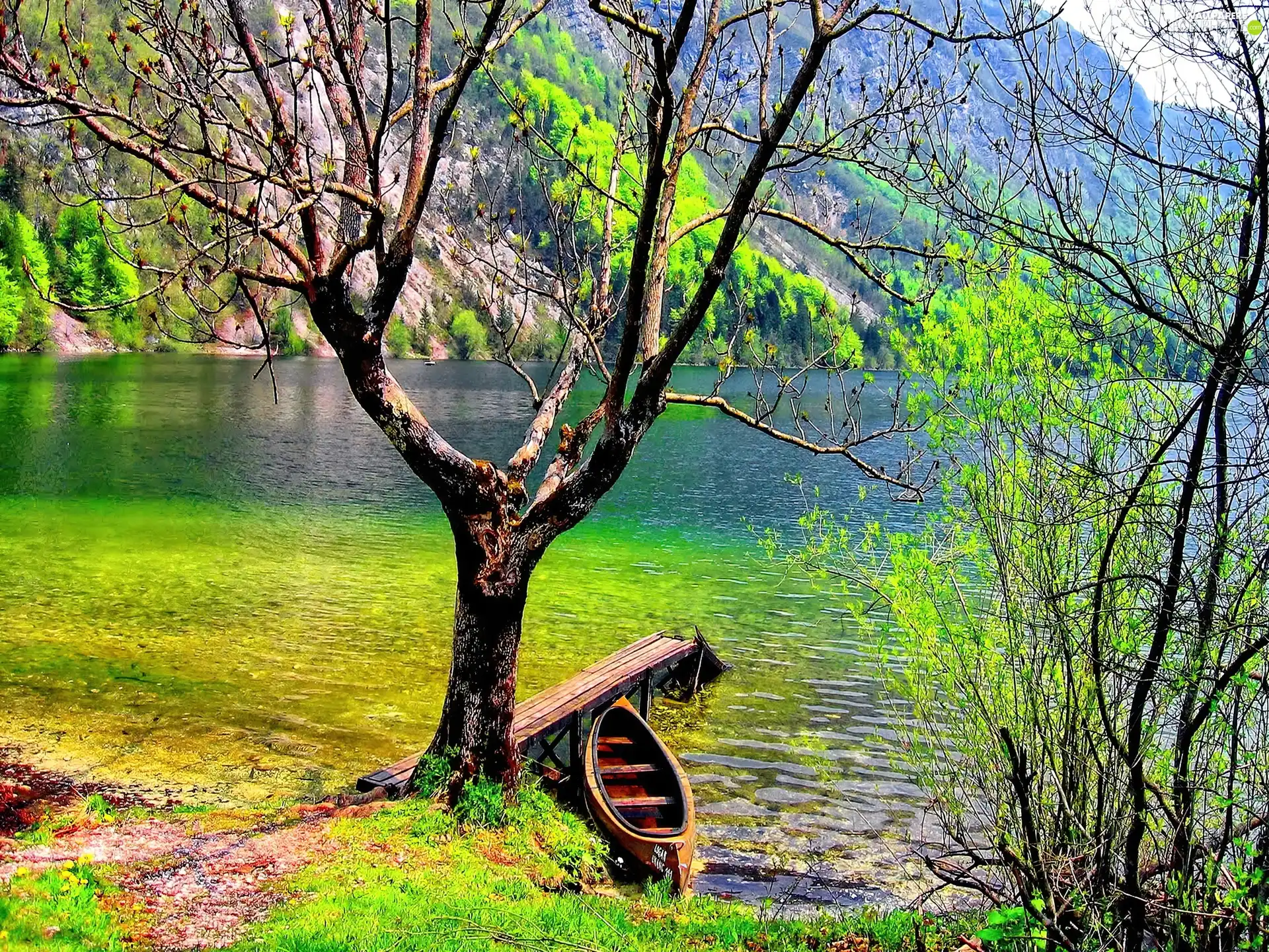 trees, Boat, lake, viewes