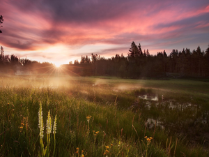 Mountains, lake, trees, viewes, Lighthouse, photomontage, bench, Pavement, Lawn