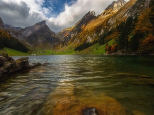 Palms, Yacht, viewes, Mountains, lake, trees, clouds