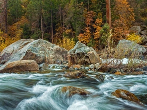 trees, autumn, rocks, River, viewes, color