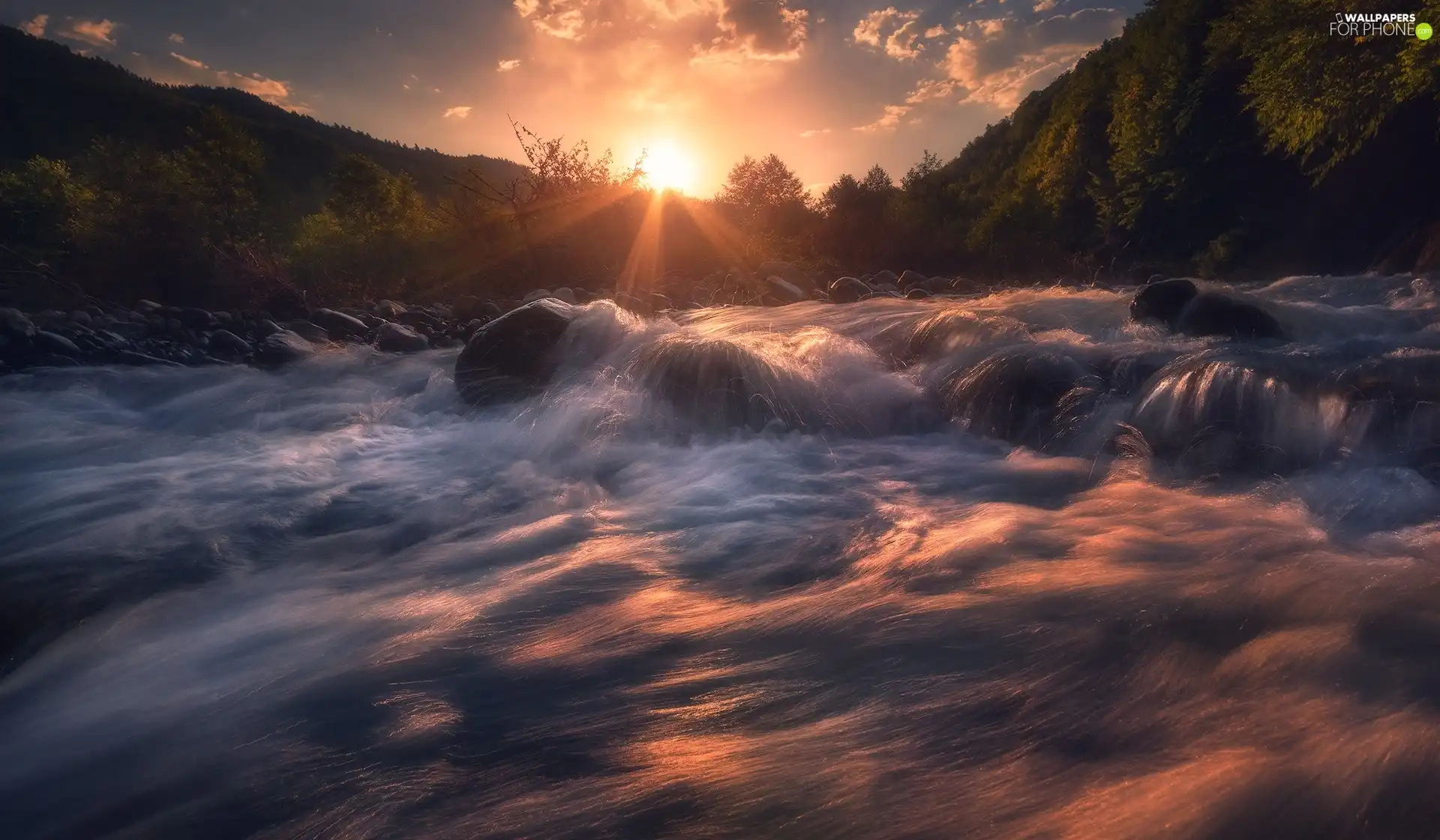 River, Sunrise, forest, Stones