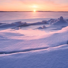viewes, Snowy, evening, trees, winter, drifts, Great Sunsets
