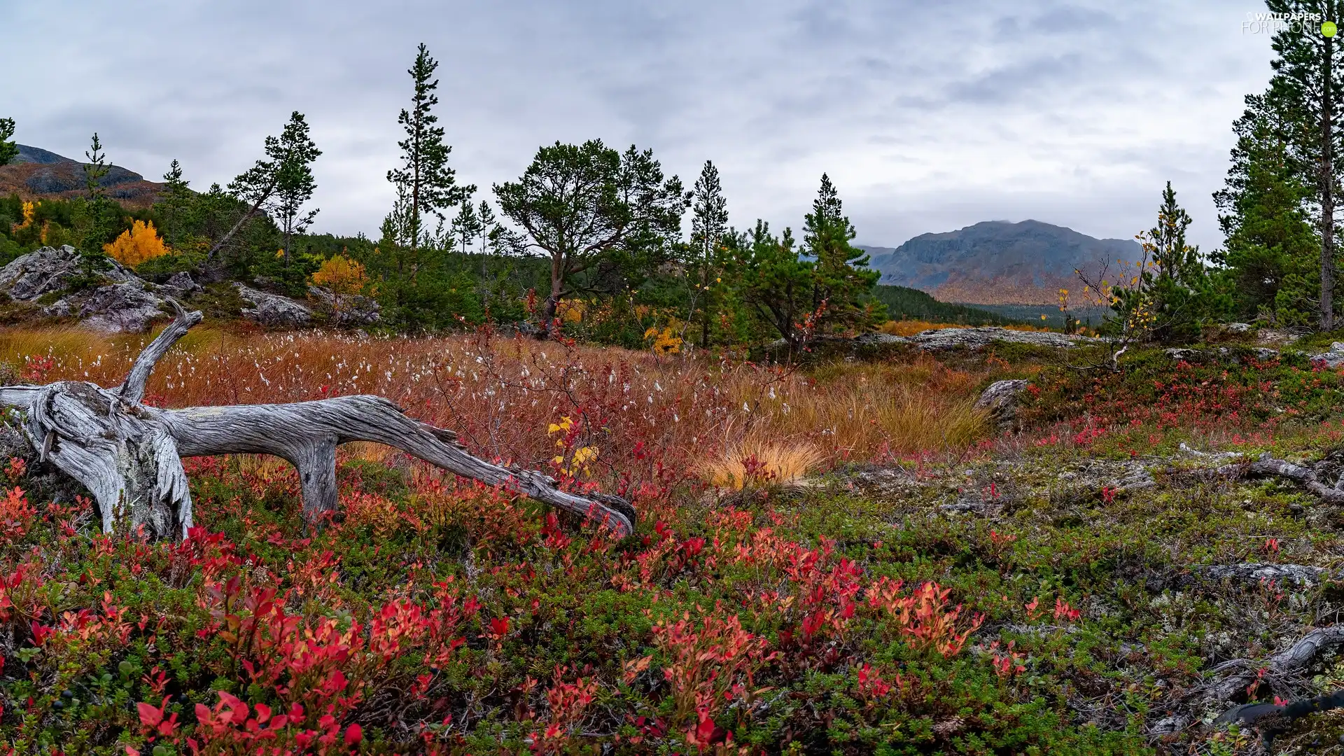 color, Bush, Plants, trees, Lod on the beach, mountains, autumn, viewes
