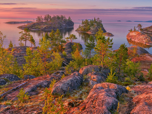 viewes, heathers, Fog, trees, heath, clouds, Sunrise