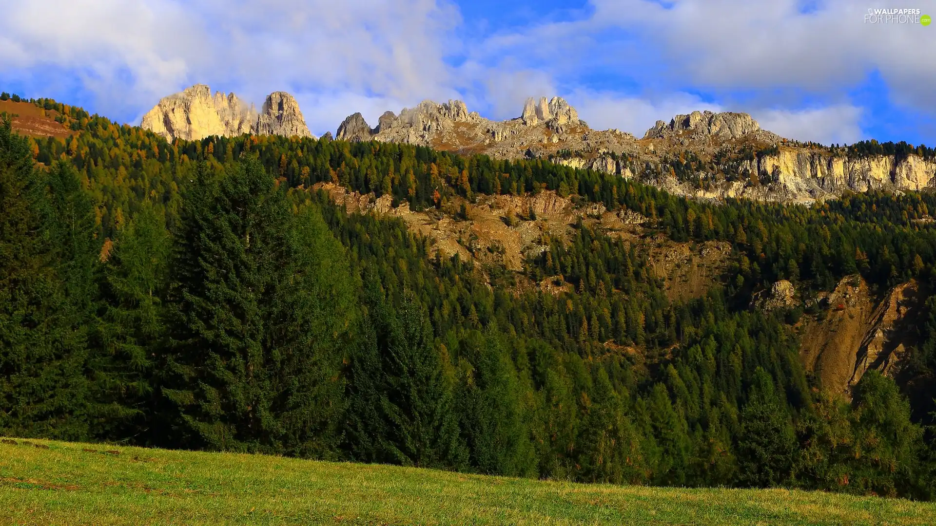 viewes, rocks, Green, trees, Mountains, Spruces, forest