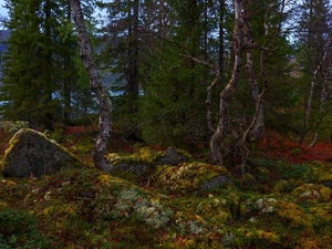 trees, Sunrise, lake