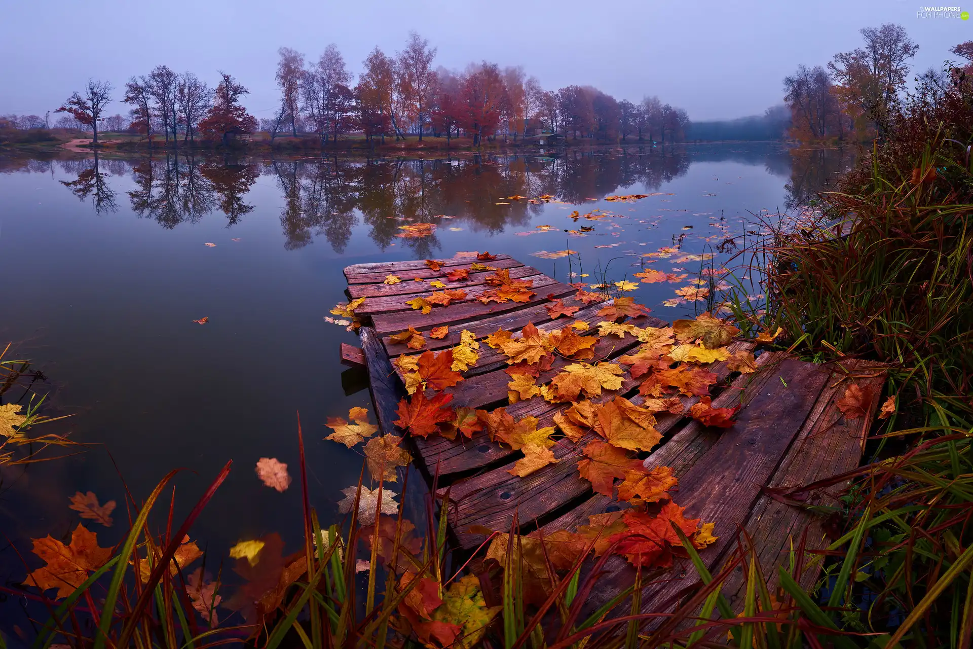 viewes, lake, Leaf, trees, autumn, fallen, Platform