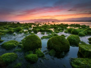 viewes, Snowy, Pinkish, trees, winter, rocks, clouds