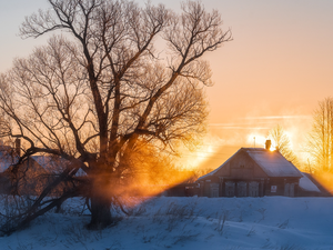 trees, winter, Bench, rays of the Sun, viewes, Mountains