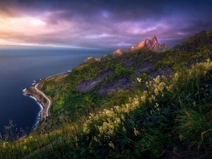 trees, Lod on the beach, clouds, lake, Mountains, viewes, reflection