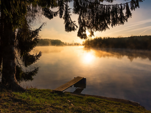 rocks, River, Fog, trees, pine, Sunrise, Mountains, viewes