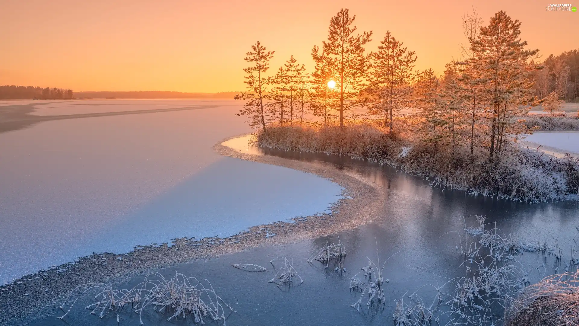 lake, Ladoga, Sunrise, trees, winter, Karelia, Russia, viewes