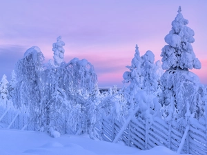 viewes, Spruces, Great Sunsets, snow, rays, trees, winter, traces